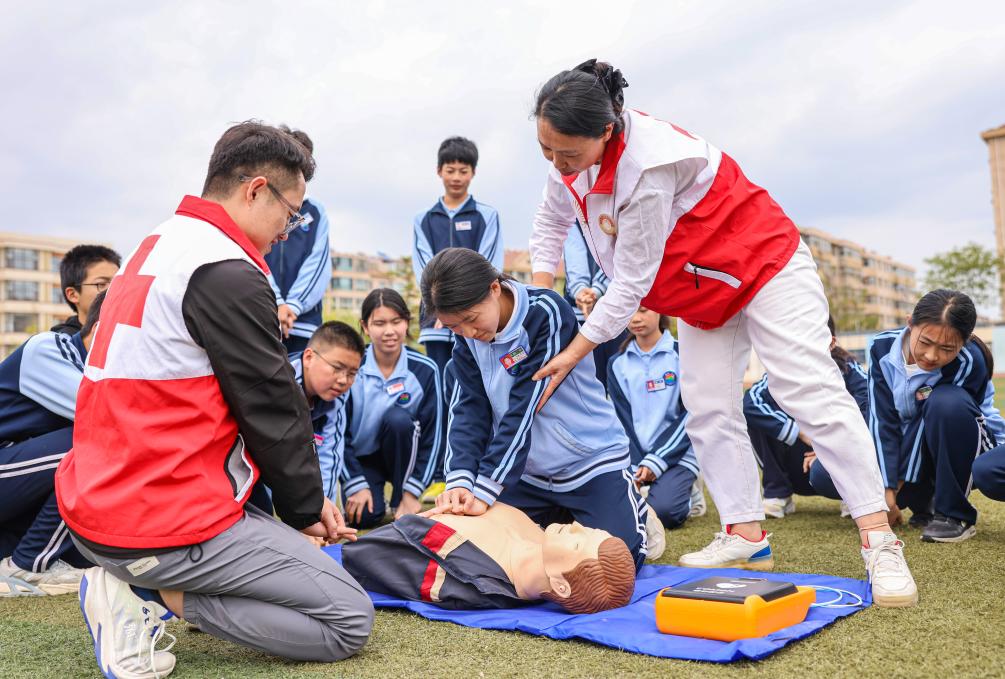 5月7日,在山东省荣成市第二实验中学操场,志愿者为学生们传授心肺复苏急救技能。