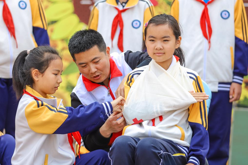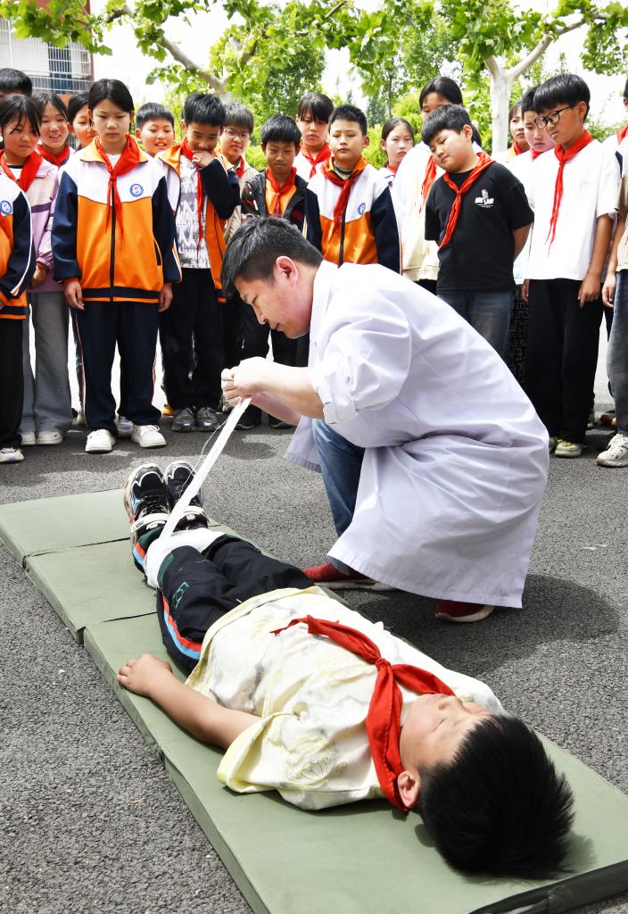 5月7日,在山东省枣庄市山亭区店子镇中心小学,医务人员为学生传授救护包扎知识。