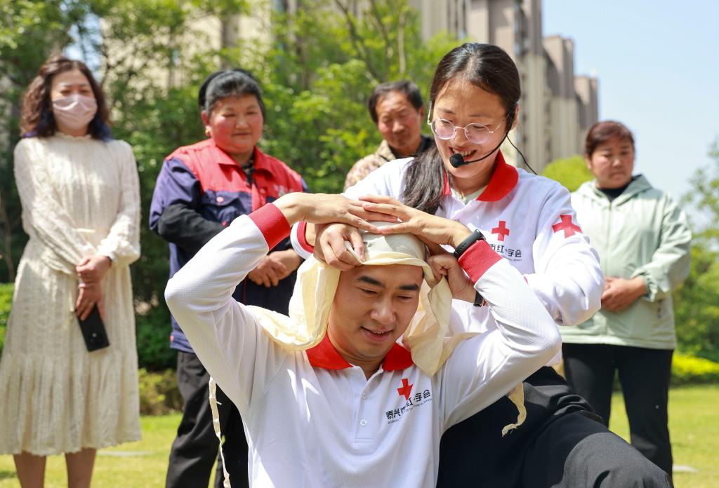 5月7日,在江苏省泰兴市济川街道张陈社区燕澜花园睦邻点,泰兴市红十字会的工作人员传授创伤救护知识。