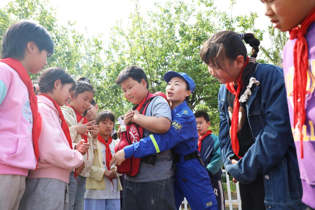 5月7日,红十字会工作人员在湖南省永州市道县第四小学为学生们指导防溺水救援技能。
