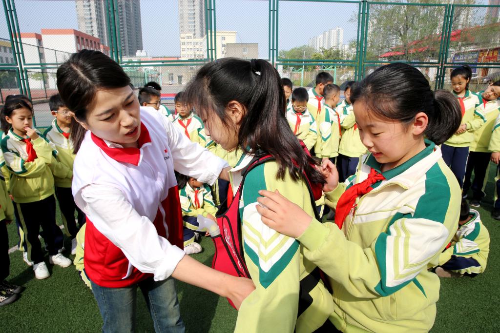 5月7日,在江苏省连云港市院前小学,连云港市连云区红十字会的志愿者为学生传授海姆立克急救法。