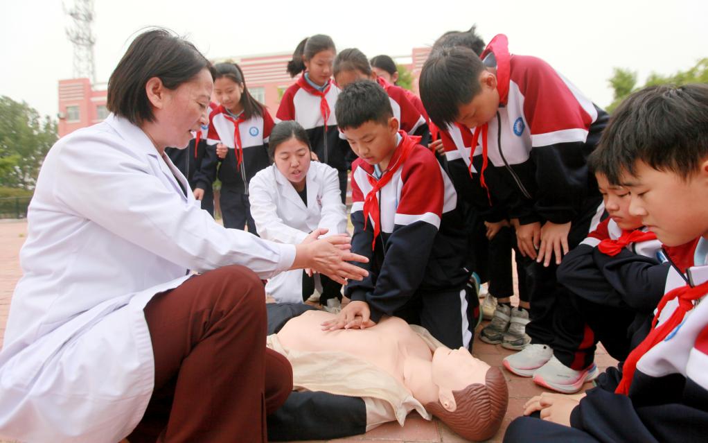 5月8日,在河北省石家庄新乐市民生街小学,新乐市中医院的急救人员为学生讲解心肺复苏急救知识。