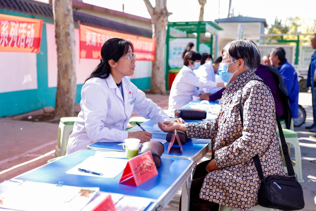 5月8日,在河北省唐山市丰南区东田庄镇东田庄村,医疗志愿者为村民进行中医诊疗。