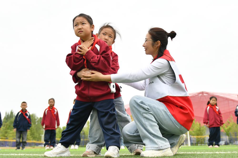 5月8日,在山东省烟台市福山区芝阳山学校,红十字志愿者指导学生练习海姆立克急救法。