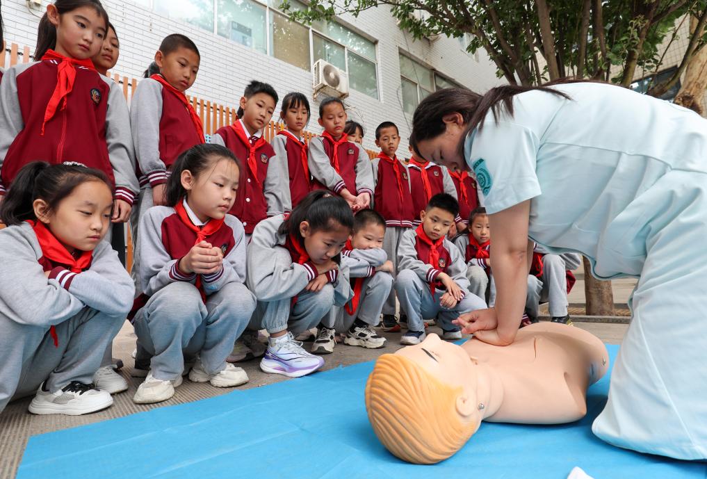 5月8日,河北省石家庄市南马路小学的学生在医务人员指导下学习心肺复苏知识。