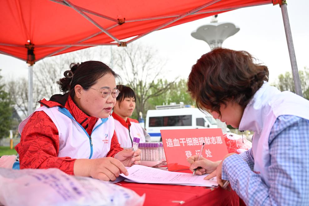 5月8日,志愿者(左)在内蒙古呼和浩特市新城区宝鼎广场协助市民进行造血干细胞捐献志愿登记。