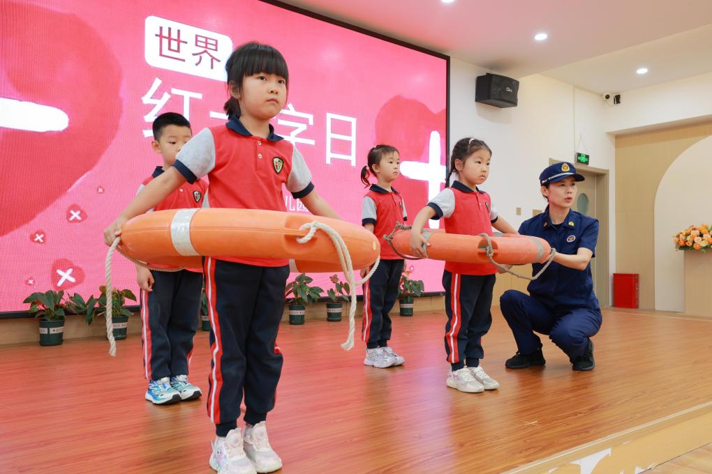 5月8日,在河北省邢台市内丘县幼儿园,消防员给小朋友讲解救生圈的使用。