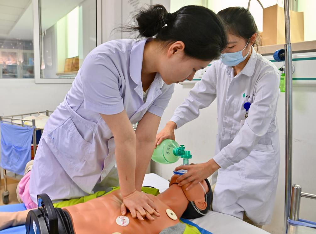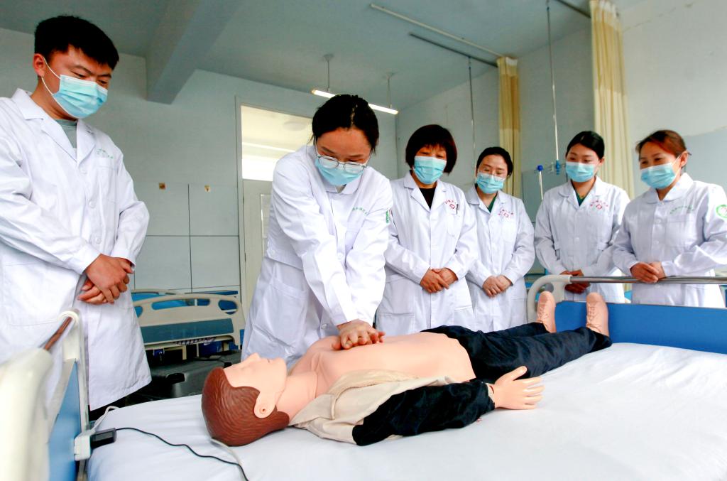 5月8日,在位于沈阳的中国医科大学附属第一医院内,实习护士在练习心肺复苏术。
