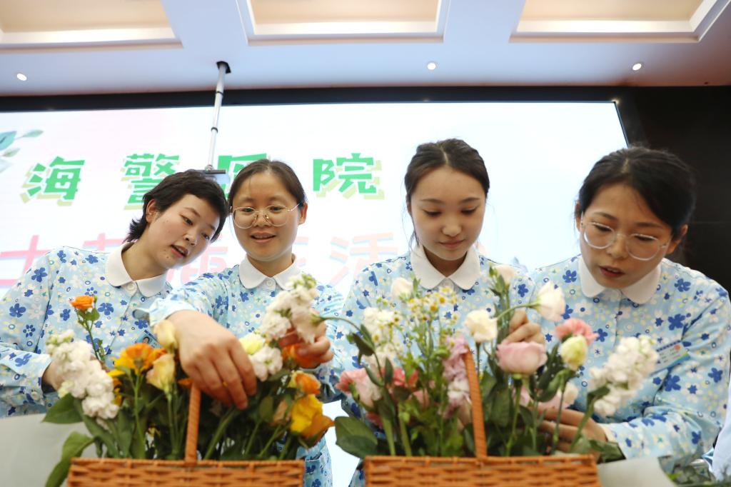 5月9日,在浙江省嘉兴市,海警医院护士参加插花活动。