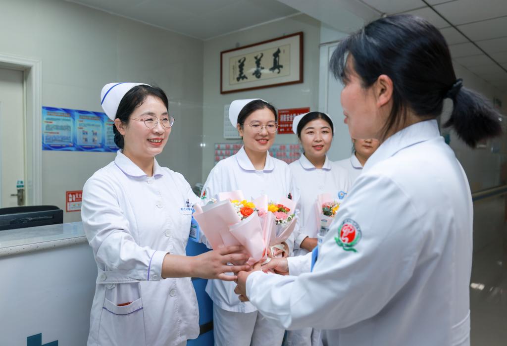 5月10日,在山东省枣庄市精神卫生中心,医生给护士献花。