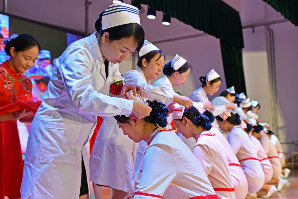 5月8日,在山东省烟台护士学校举行的护士节授帽仪式上,资深护理人员为学生授帽。