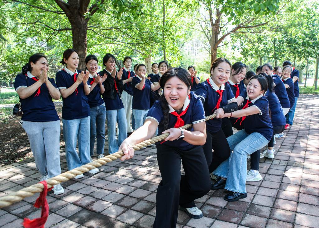 5月9日,河南省博爱县清化镇卫生院护士在“忆童年”主题趣味运动会上拔河。