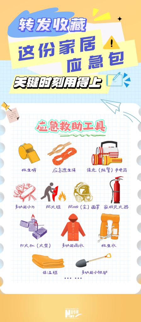 手电筒、救生哨、应急逃生绳、瓶装水、饼干、罐头、创客贴、碘伏棉棒……发生灾情时,自救是最迅速有效的。日常居家,应准备哪些应急物品?2025年5月12日是第17个全国防灾减灾日,转发收藏这份“应急包”,关键时刻用得上!