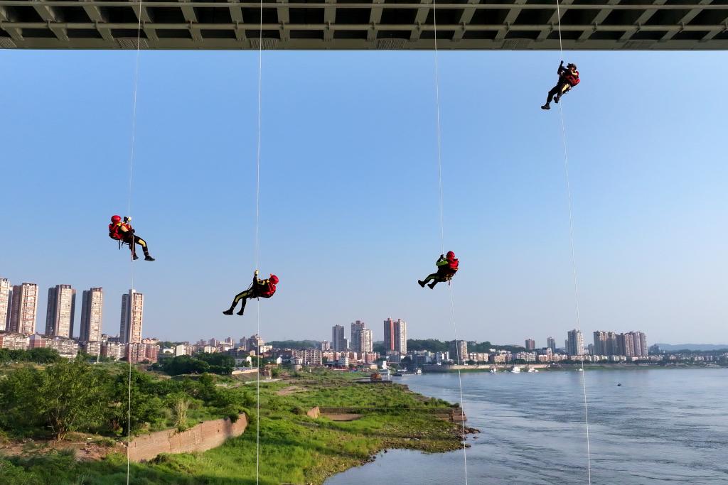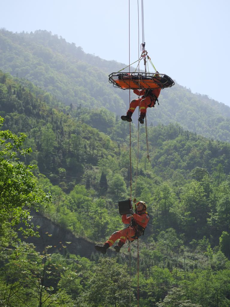 5月12日,在雅安市石棉县举行的四川省2025年抗震救灾演练中,四川省森林消防总队特勤大队消防员利用绳索系统高空转移“伤员”。