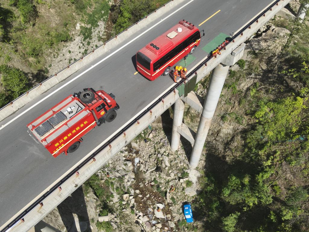 5月12日,在雅安市石棉县举行的四川省2025年抗震救灾演练中,四川省森林消防总队特勤大队二中队消防员对“坠崖人员”进行搜救(无人机照片)。