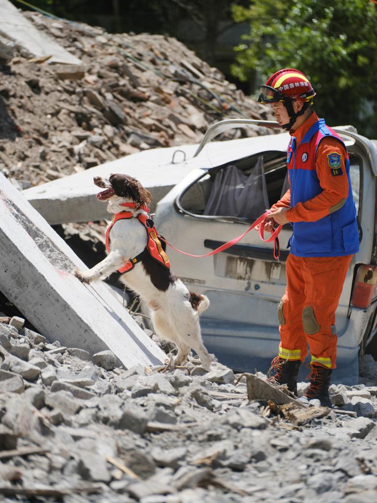 5月12日,在雅安市石棉县举行的四川省2025年抗震救灾演练中,四川省森林消防总队特勤大队消防员和搜救犬在地震演练现场搜索“被困人员”。