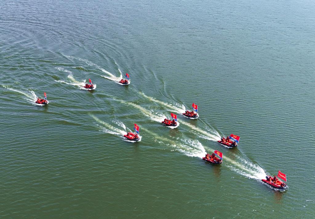 5月12日,在河南省南阳市开展的防汛抢险综合应急演练中,消防人员驾驶动力皮划艇进行水上救援演练(无人机照片)。