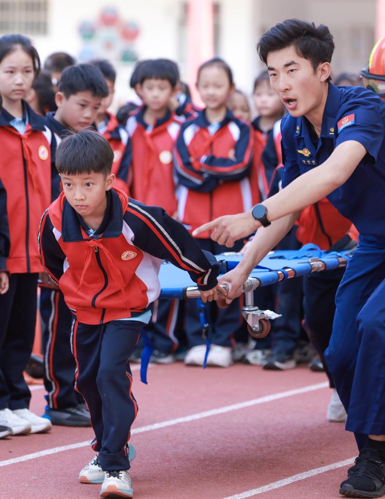 5月12日,在山东省枣庄市薛城区矿建路小学,学生在消防员的指导下体验多功能担架救援演练。
