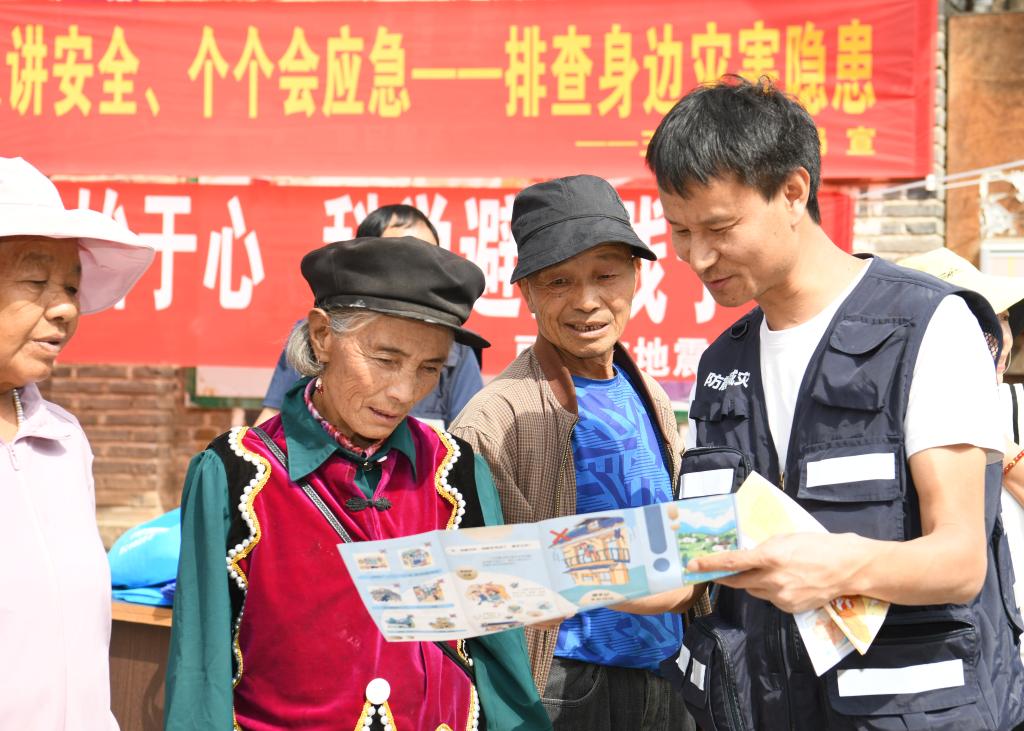 5月12日,云南省丽江市地震局工作人员在玉龙县石鼓镇格子村给村民讲解防震减灾知识。