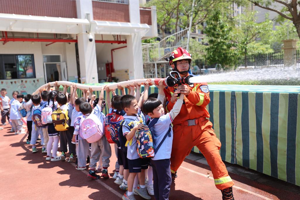 5月12日,在福建省厦门市翔安教育集团滨海幼儿园,翔安区消防救援大队消防员指导孩子们使用水枪出水“灭火”。