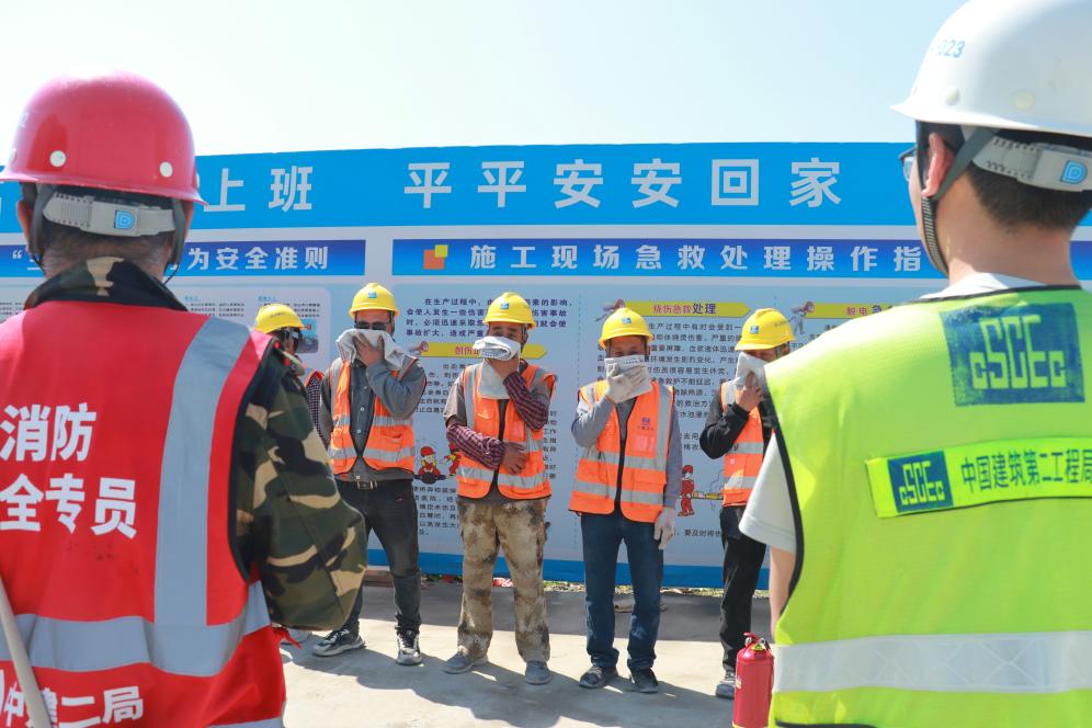 5月12日,中建二局工人在江苏无锡K11项目工地学习如何在遇到火情时开展自救。
