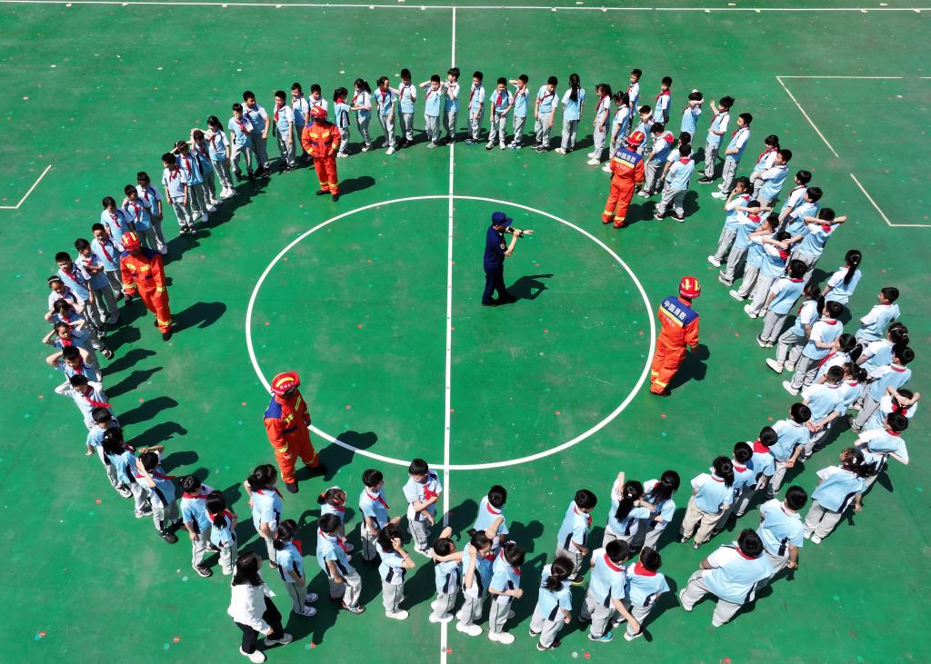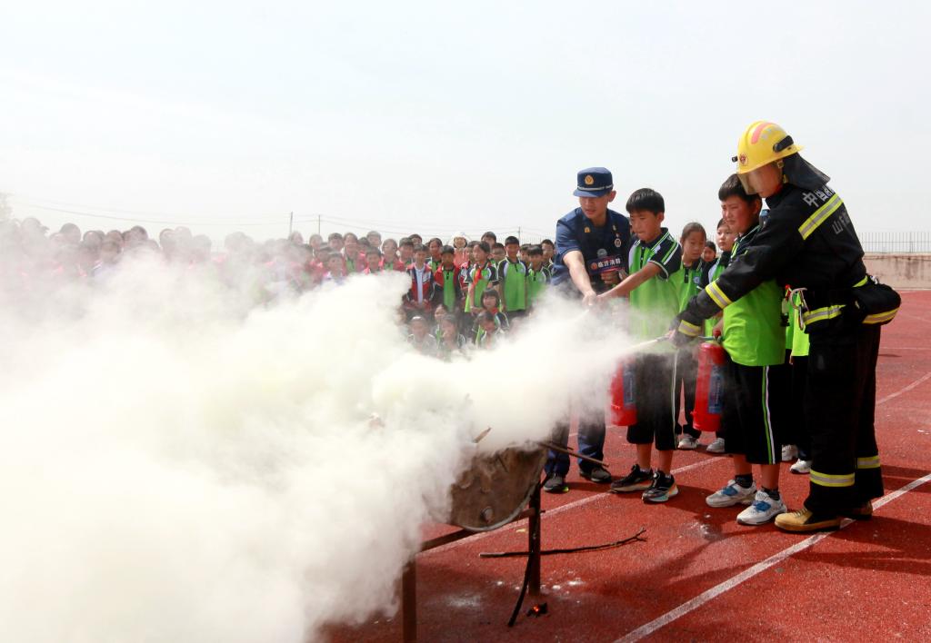 5月12日,在山东省临沂市平邑县保太镇中心小学,消防救援队员指导学生使用灭火器。
