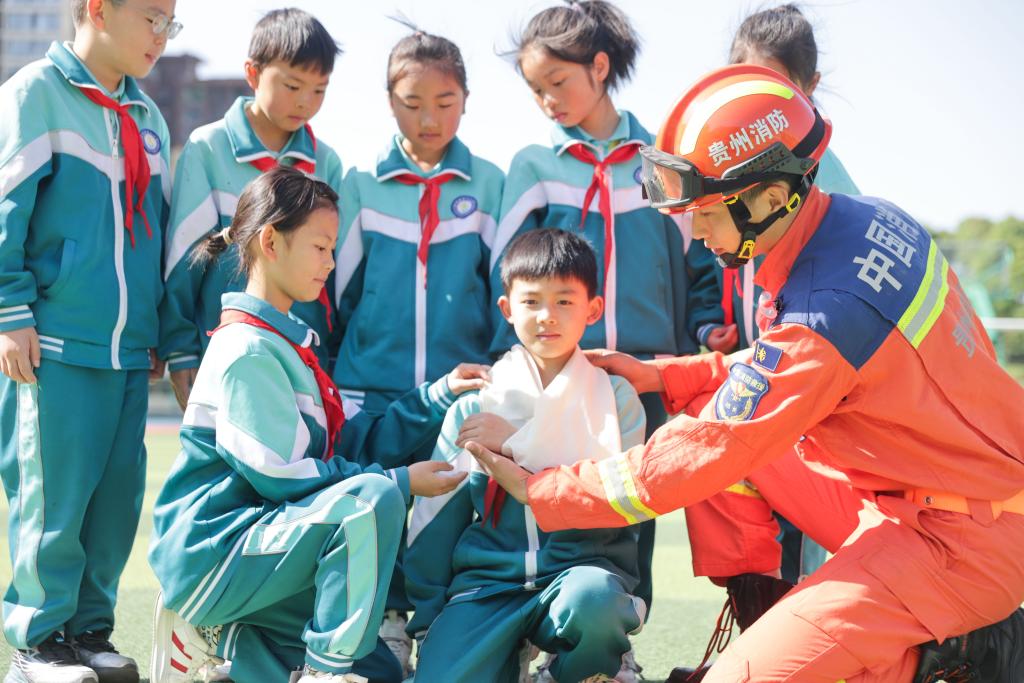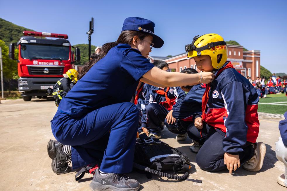 5月12日,贵州省安顺经济技术开发区消防救援大队消防员在安顺黄齐生小学指导学生体验穿戴水域救援装备。