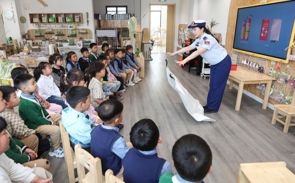 5月12日,江苏淮安生态文旅区消防救援大队消防员为幼儿园小朋友讲解防灾减灾知识。