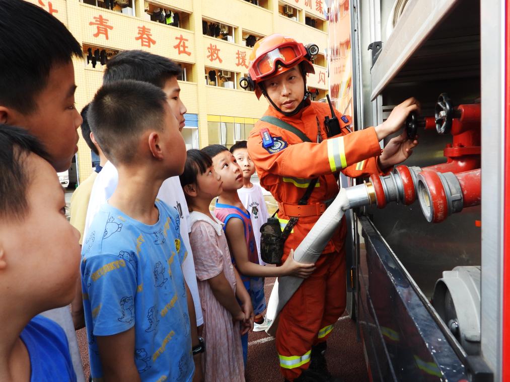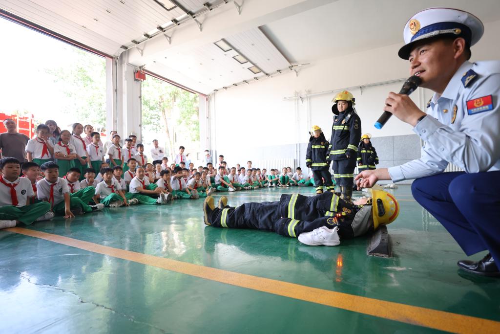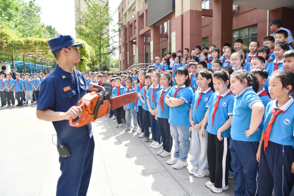 5月12日,在河北省石家庄市栾城区兴安大街小学,消防队员为学生讲解消防装备。