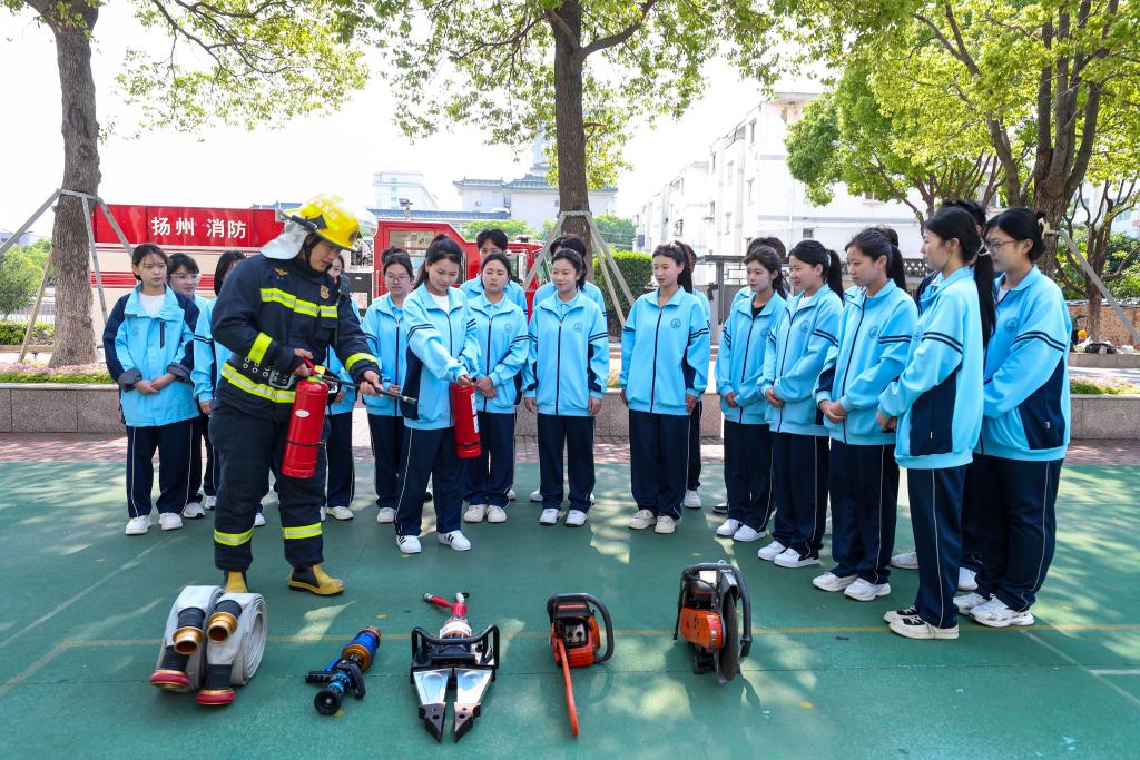 5月12日,在江苏省扬州市江都区第二中学,扬州市江都区消防救援大队消防员给学生演示消防职业技能。