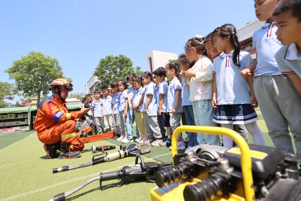 5月12日,在福建省厦门市翔安教育集团滨海幼儿园,翔安区消防救援大队消防员为孩子们介绍消防器材装备的用途和使用方法。