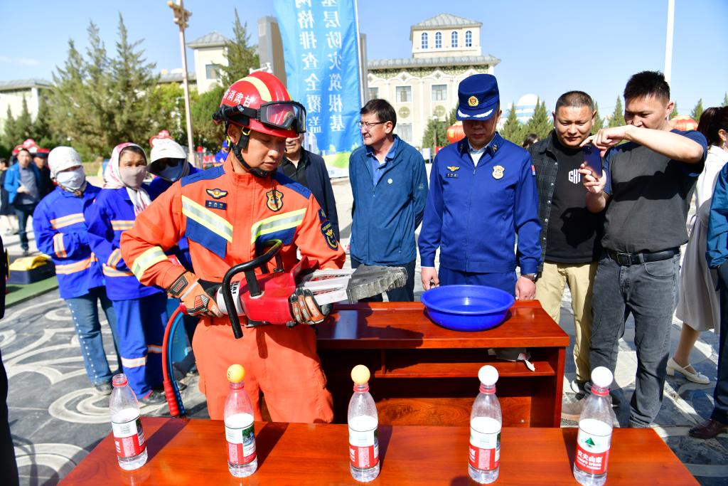 5月12日,在甘肃省阿克塞哈萨克族自治县文化广场,消防队员为群众展示消防救援器材。
