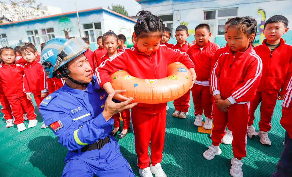 5月12日,蓝天救援队员在河北省遵化市遵化镇南关幼儿园给小朋友讲解救生圈使用方法。
