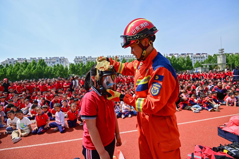 5月12日,在山东省临沂市郯城县第三实验小学,小学生在消防救援人员的帮助下体验使用灭火装备。
