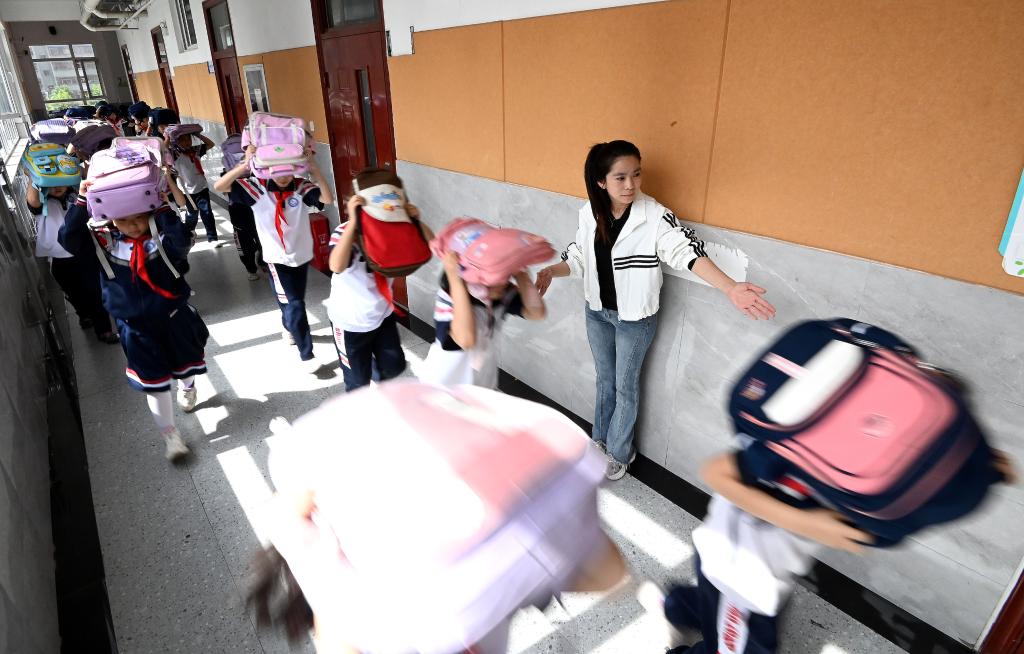 5月12日,河北省邯郸市邯山区实验中学小学部的学生们在防震演练中紧急疏散。