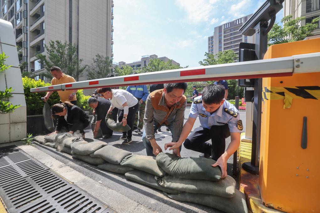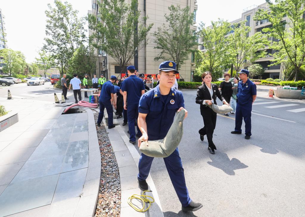 5月14日,道场乡应急消防管理站工作人员和消防队员指导湖山府社区的物业工作人员开展防汛沙袋堆砌和排水设备操作。