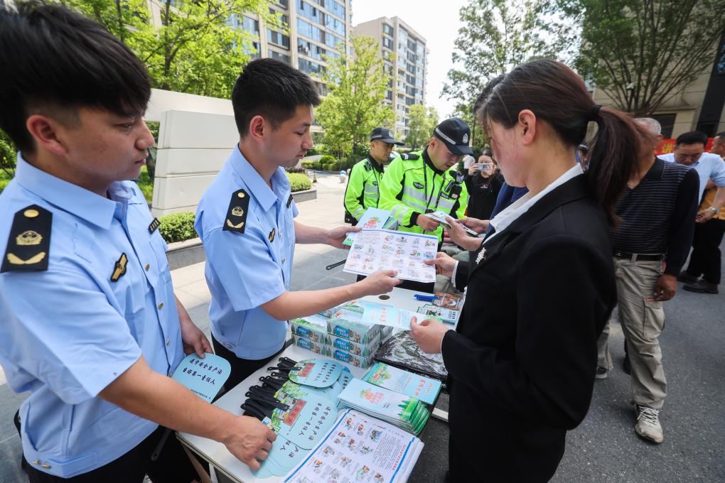 5月14日,道场乡应急消防管理站工作人员在湖山府社区给社区居民和物业工作人员发放防灾减灾宣传册。