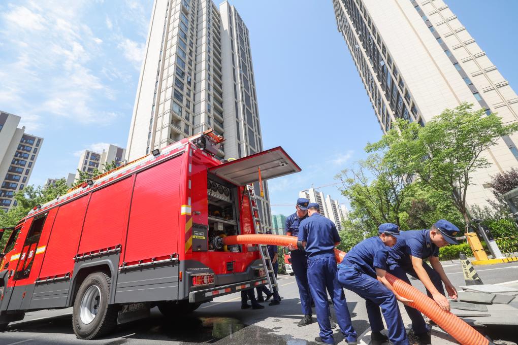 5月14日,道场乡消防队员在湖山府社区开展防汛排水设备操作演练。