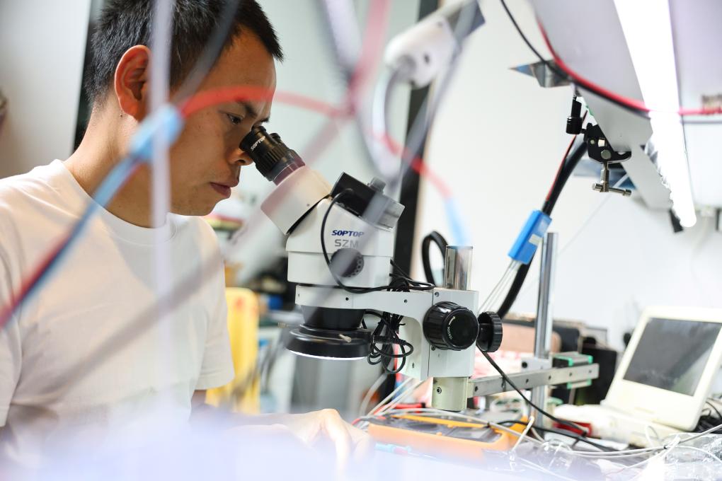 5月17日,柯水昌(左)在维修工作间内维修手机。