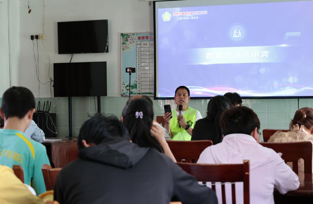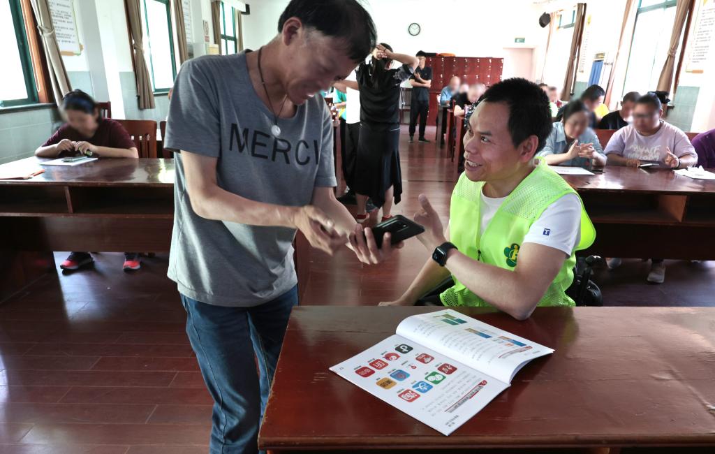 5月13日,柯水昌在上海奉贤区南桥镇一个阳光之家教室内为学员讲解手机使用中遇到的问题。