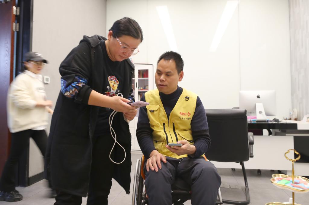 柯水昌在办公室里用通过手机软件跟听障女孩刘莹交流,刘莹在柯水昌的指导和帮助下创业成立了装饰气球和手工艺品制作公司(2023年4月14摄)。