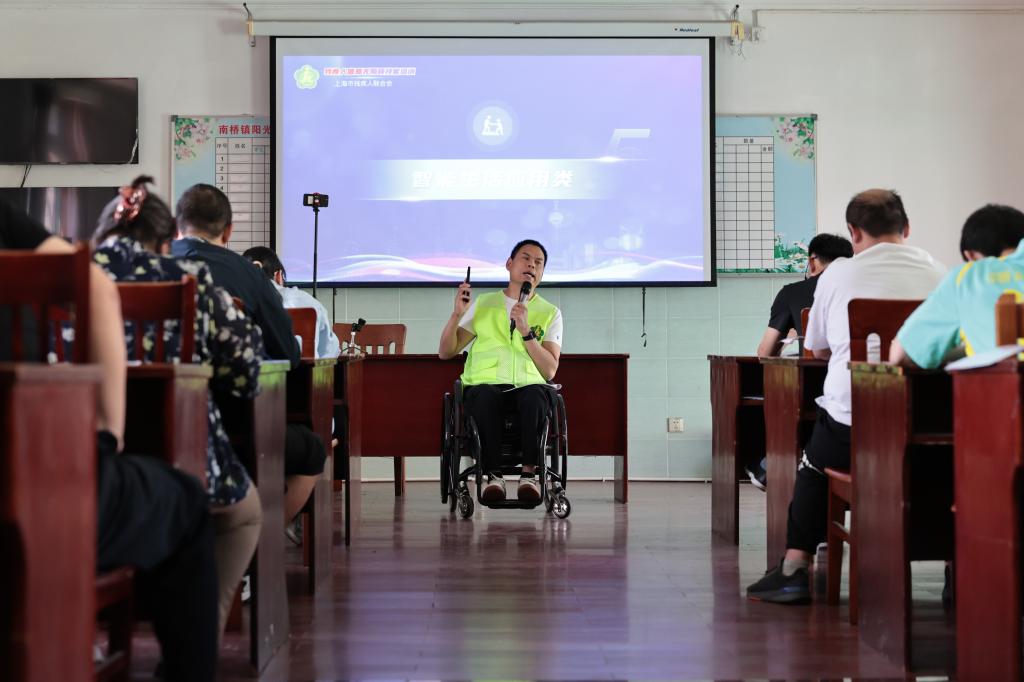 5月13日,柯水昌在上海奉贤区南桥镇一个阳光之家教室内为智力障碍学员讲解手机使用中遇到的问题。
