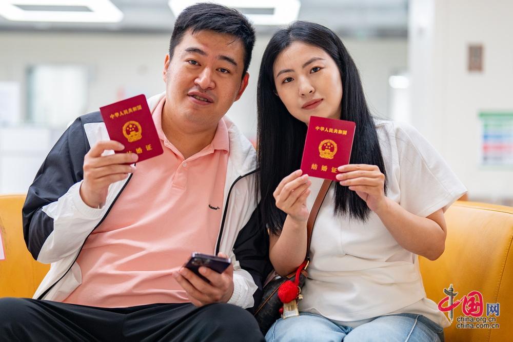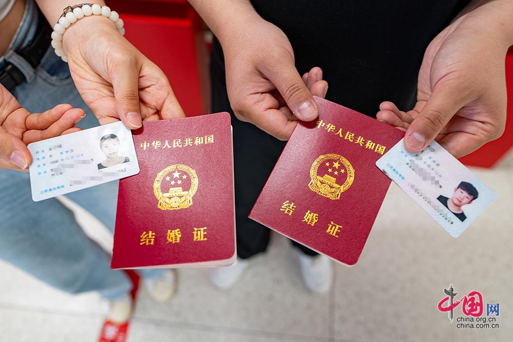 新修订的《婚姻登记条例》实施后实现婚姻登记“全国通办”,内地居民可跨省办理婚姻登记,仅需携带身份证及无配偶声明即可领证。图为5月20日,两名在京工作的天津市民在北京市丰台区办理婚姻登记。