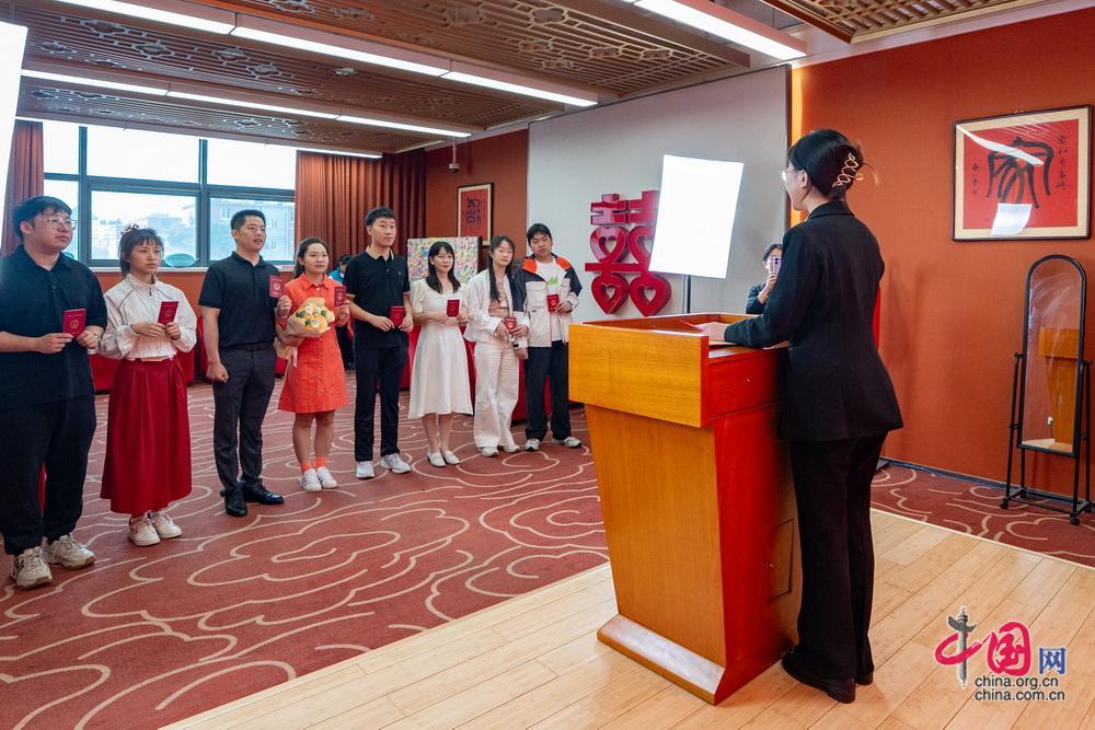 5月20日,丰台区婚姻登记事务中心开展以“缔约幸福聚今朝 丰宜福台结良缘”为主题的集体颁证活动,宣传培育新型婚姻文化,为新人发放婚俗改革倡议书,签订婚俗改革承诺书,倡导新人喜事新办,树立良好家风,创新时代婚俗,推动家庭家教家风建设高质量发展。中国网记者 郑亮摄