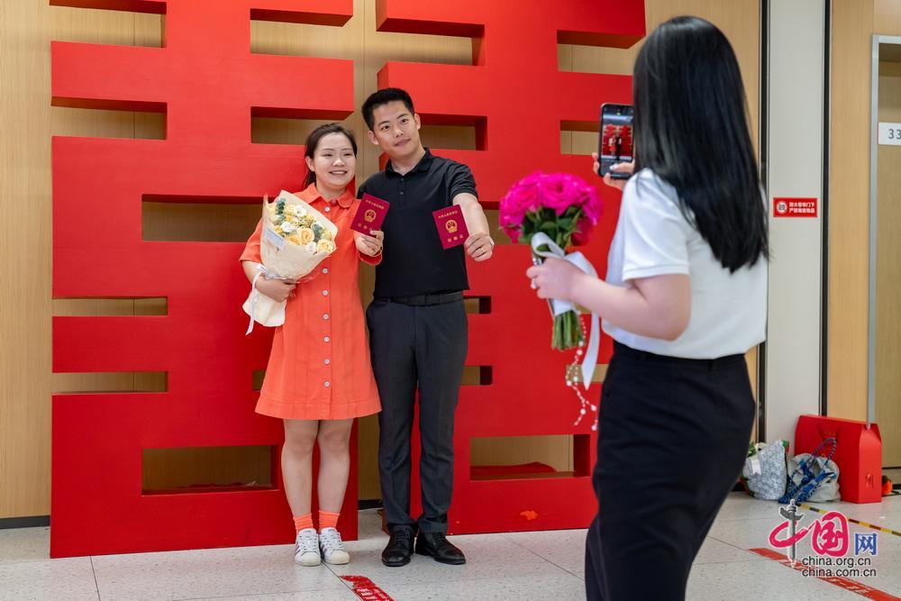 5月20日,丰台区婚姻登记事务中心现场设置了很多具有丰台历史文化特色的艺术墙、婚嫁文化墙拍照打卡场景,吸引新人合影留念。中国网记者 郑亮摄