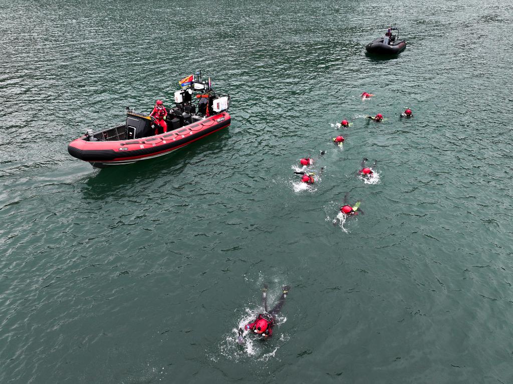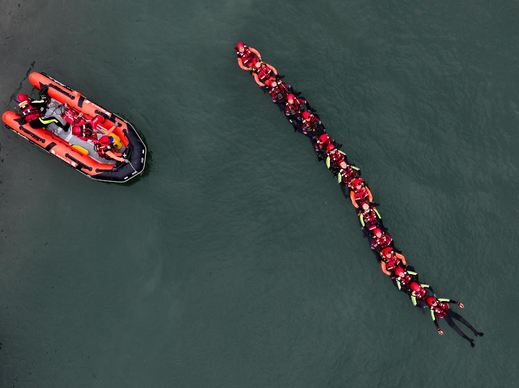 5月21日,消防救援人员在岷江成都段开展多人涉水横渡训练(无人机照片)。