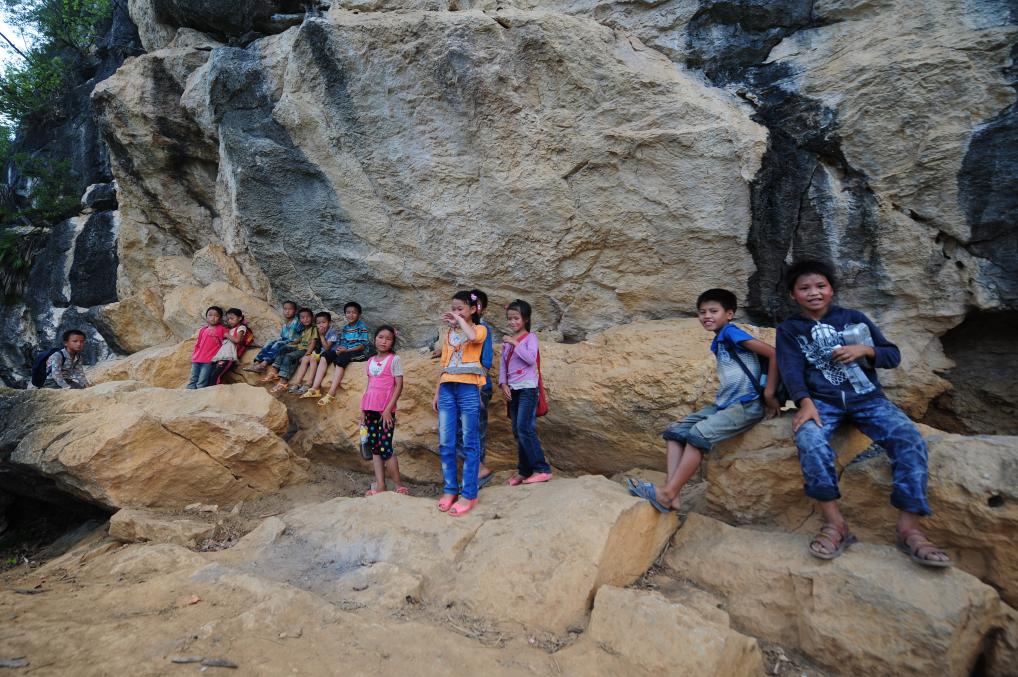 在广西大化瑶族自治县板升乡弄雷村哈宝屯,11岁的蒙富松(右二)坐在悬崖上休息(2013年5月28日摄)。