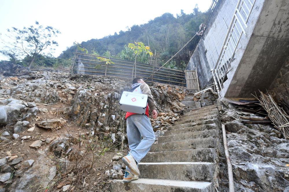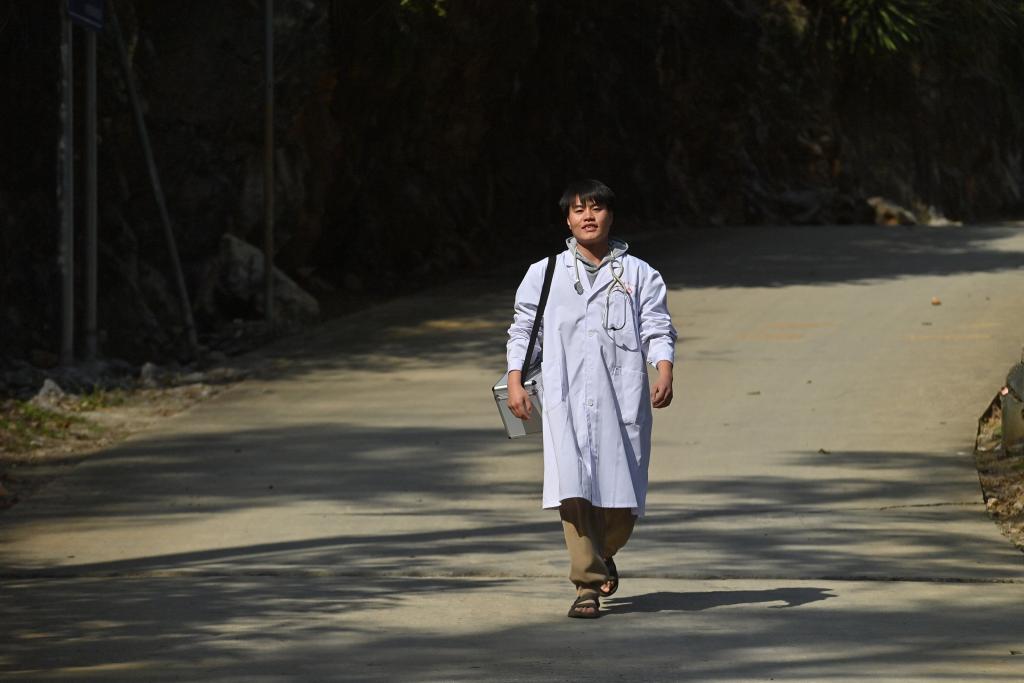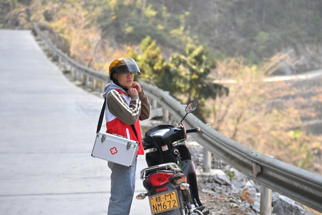 在广西大化瑶族自治县板升乡弄雷村,村医蒙富松准备进村入户给村民看病(2024年3月6日摄)。