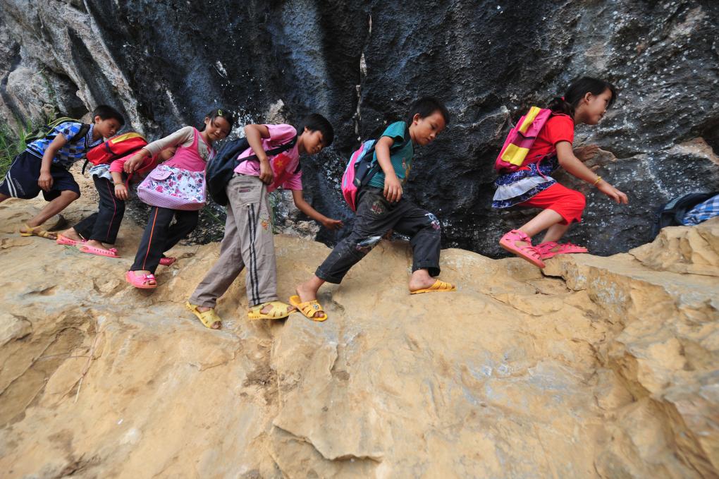 在广西大化瑶族自治县板升乡弄雷村哈宝屯,10岁的蒙富松(左一)爬悬崖去学校读书(2012年9月3日摄)。