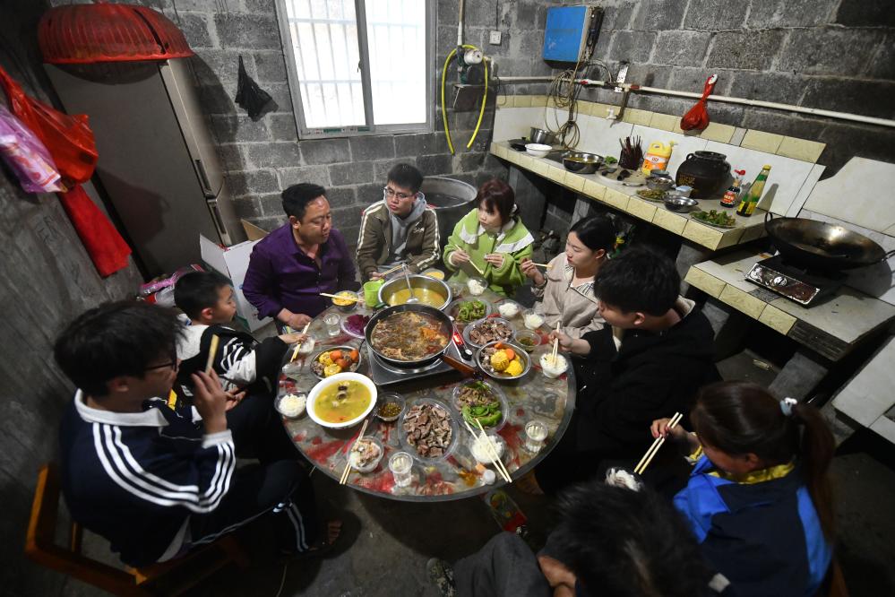 在广西大化瑶族自治县板升乡弄雷村,村医蒙富松(左四)和家人吃团圆饭(2025年1月20日摄)。